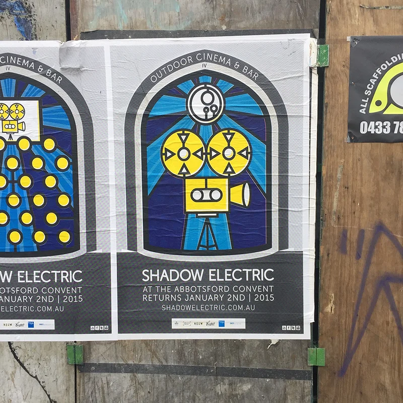 Shadow Electric has always been a good friend of The Books. And each year we give their cinema collateral / season program a new look. The above was heavily inspired by lead-light windows, as the Shadow Electric was situated inside a convent!